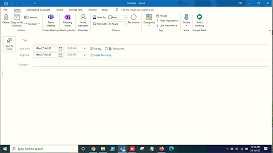 7. Then go to the calendar from Outlook and try to schedule a meeting. Here it will show you the Google Meet addin